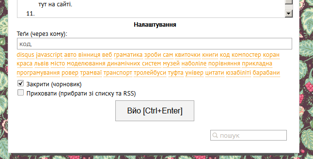 Виводяться n найчастіше вживаних теґів, їх можна вставити до запису просто по кліку. Файл templates/post_form.html.
