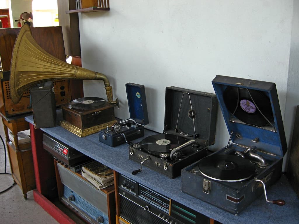 Ціла купа різних грамофонів, патефонів, електрофонів, радіоприймачів, радіол, телевізорів.